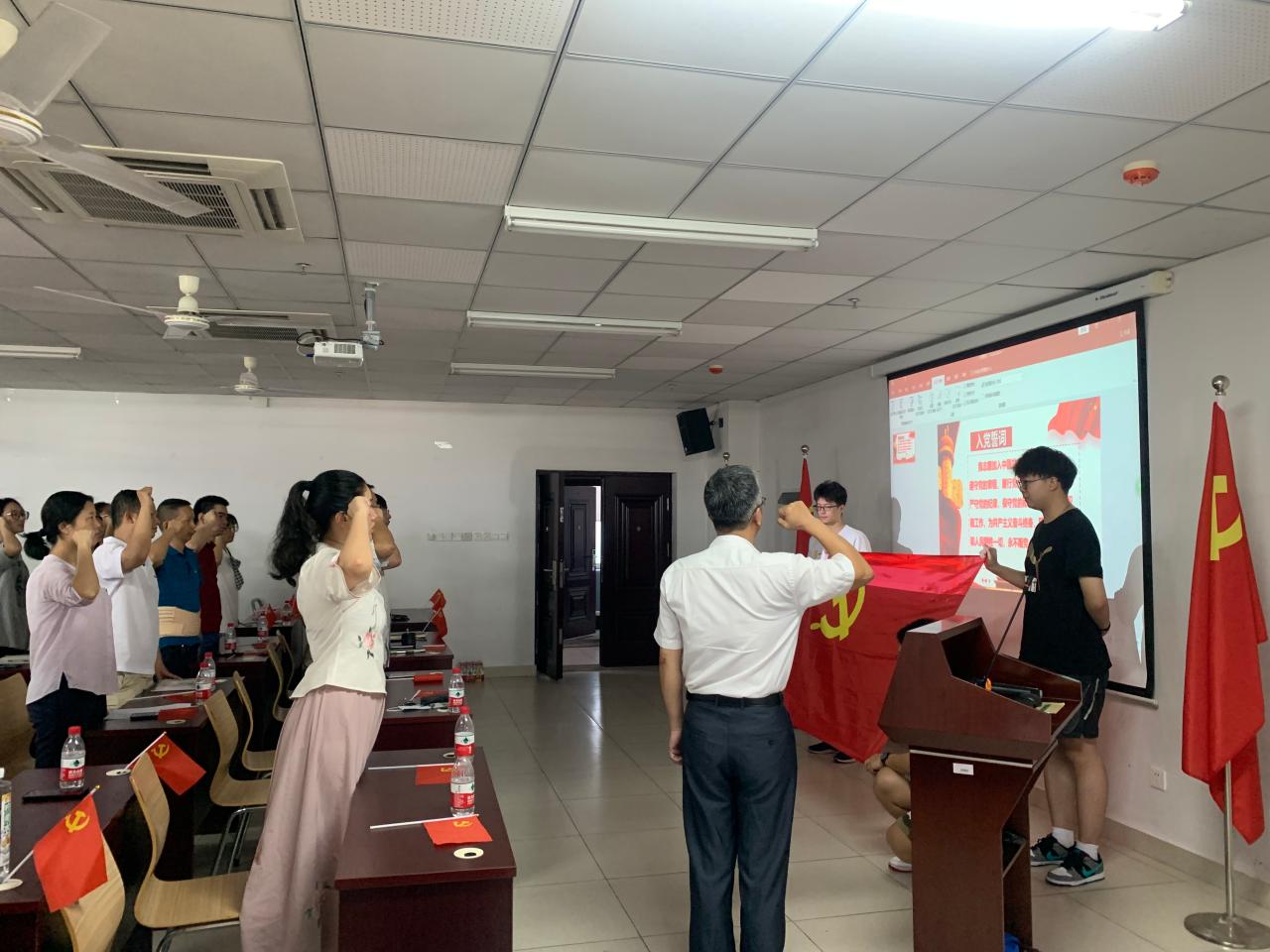 直播会后,与会党员们同唱《没有共产党就没有新中国》,在党委书记邓秀成同志带领下重温入党誓词。随后,学院举行了2021年新党员入党宣誓仪式。