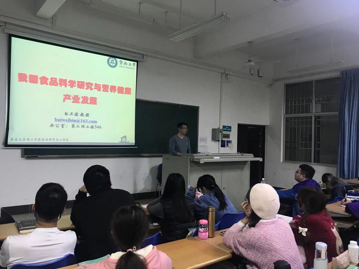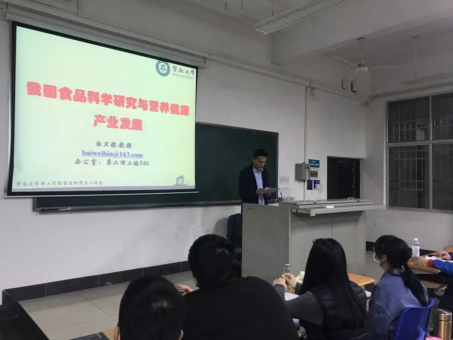 2020年12月23日,暨南大学白卫滨教授来ac米兰官网为2018级食品质量与安全系的本科生进行冬季小学期的授课。授课内容围绕“食品功能因子在体内外的营养学评价以及对健康产业发展的展望”展开。