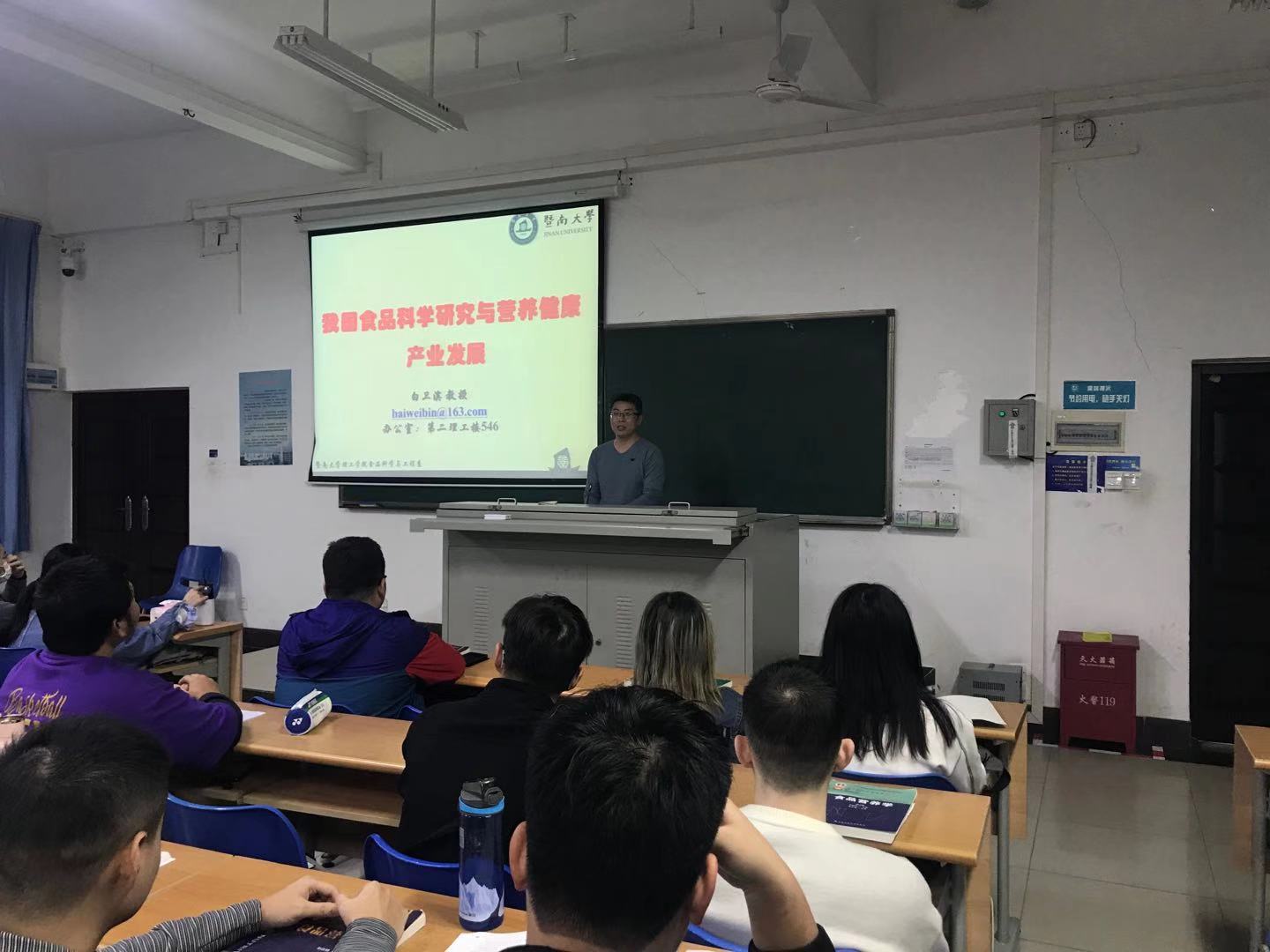 在开始上课前,ac米兰官网李武副院长对白卫滨教授进行简要的介绍:白卫滨教授现任暨南大学理工学院副院长,兼食品科学与工程系主任、食品安全与营养研究院常务副院长,广东省食品安全分子快速检测工程技术中心主任,广东省食品学会青年工作委员会主任,中国食品科学技术学会第三届青年工作委员会委员,食品领域TOP期刊 Critical Reviews in Food Science and Nutrition 和Food and Chemical Toxicology杂志客座主编。入选教育部新世纪优秀人才支持计划,广东省高校优秀青年教师培养计划。任暨南大学食品安全与营养方向学科带头人,主要研究方向为富含花色苷果蔬的产品开发及功能研究、食物中有害物风险评估及营养干预、食品分子快速检测溯源技术等。近五年主持了国家自然科学基金 3 项,国家重点研发计划课题任务1 项,“十二五”国家科技支撑计划课题 1 项,广东省重点研发计划1项,广州市民生科技重大专项1项。以第一作者或者通讯作者发表学术论文 50 余篇,其中已第一或者通讯作者发表在食品领域top 期刊《Critical Reviews in Food Science and Nutrition 》、《Journal of Agricultural and Food Chemistry》、《Food Chemistry》等SCI论文30余篇。申请发明专利10项,授权 5项,并转让1项。起草地方标准2项(第一和第二起草人)。参编著作 4 部(其中副主编 1 部)。