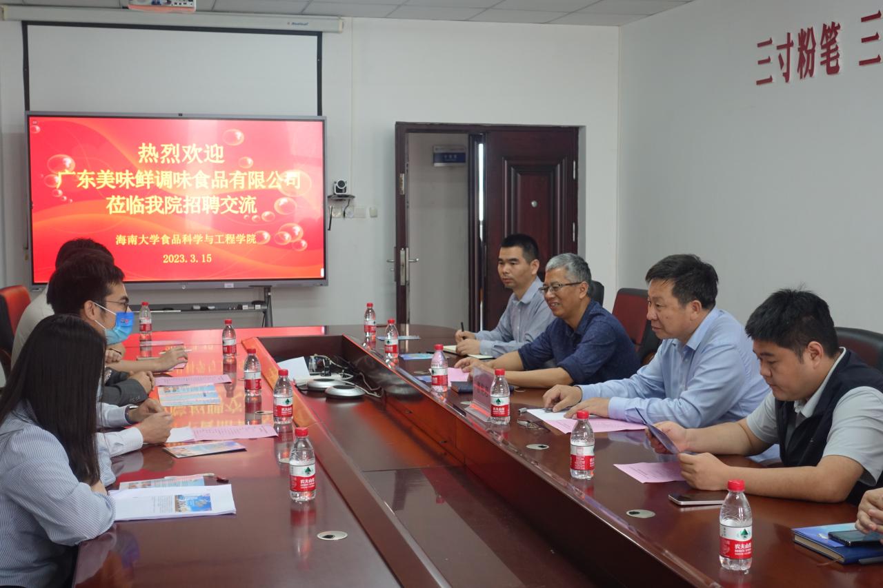 为进一步推进校企合作、深化产教融合、拓宽就业渠道,3月15日上午,曹宪忠副校长出席ac米兰官方网站与来访的广东美味鲜调味品有限公司“访企拓岗”座谈会。参加座谈会的有广东美味鲜调味品有限公司招聘经理司徒奕威、生产部门经理全斌、招聘专员张樱桃和欧阳天。ac米兰官网邓秀成书记、张家超副院长、李川副院长、食品科学与工程系主任潘永贵教授、食品质量与安全系主任云永欢副教授参加座谈。座谈会由邓秀成书记主持。