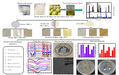 2022年8月4日,ac米兰官方网站热带农产品加工与高值化利用团队王露副教授实验室利用海南芒果皮果胶/壳聚糖与诺丽果提取液为原料制备了新型、具有多种生物活性的食品级包装膜材料,本研究阐释了诺丽果提取液的添加对果胶/壳聚糖聚合物合成膜材料物理化学及生物活性的影响,为以农产品中天然大分子聚合物为原料合成新型、功能化食品包装膜材料提供重要的参考。相关结果发表在《Food Hydrocolloids》(IF=11.5,中科院1区TOP期刊),题目为“Fabrication, characterization and biological properties of pectin and/or chitosan-based films incorporated with noni (Morinda citrifolia) fruit extract”。
