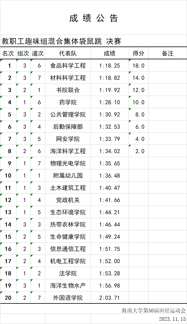 根据ac米兰官方网站第50届校运会成绩公告,ac米兰官方网站以1:18.25的成绩获得教职工趣味组合混合集体袋鼠跳决赛第一名!