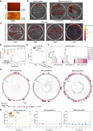团队的另一项研究采用多组学方法,深入研究了植物乳植杆菌HNU082(Lp082)在SPF级小鼠肠道内不同生态位的分布和进化趋势。结果表明,与大肠相比,小肠是Lp082主要的生存和繁殖地,在此环境中发生了比大肠中更多的进化,并且对小肠本地微生物的影响比大肠更多。在SPF级小鼠的小肠中,Lp082在第三天后开始显示出显著的遗传变异,形成了两个不同的进化分支,其中一个分支表现出更高的基因突变率。进一步的研究揭示,这些突变主要集中在与酸耐受性相关的基因上,而在SPF级小鼠大肠和无菌(GF)级小鼠肠道中未观察到这种现象,表明特定的环境压力促进了特定基因功能的改变,增强了细菌对胃酸环境的适应能力。本研究强调了肠道不同生态环境对益生菌的分布和进化的不同影响,为优化益生菌的应用和功效提供了新的理论依据。该论文ac米兰官方网站为第一单位,张家超教授为独立通讯作者,2022级博士研究生韩哲、中南大学湘雅医学院海口附属医院中心实验室黄邓高和2024级博士研究生刘欣蕾为第一作者。