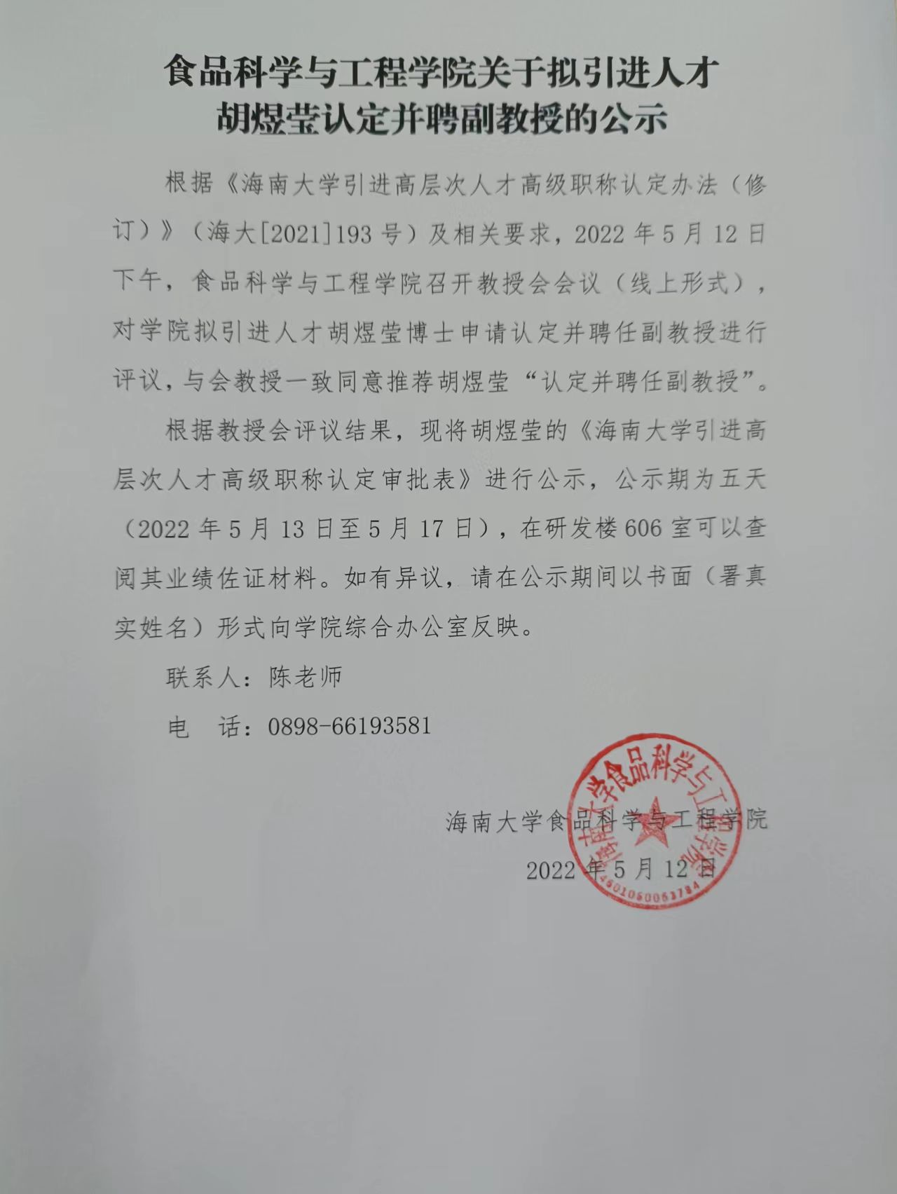 ac米兰官方网站关于拟引进人才胡煜莹认定并聘副教授的公示