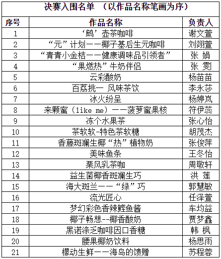根据《ac米兰官方网站第一届“热作杯”食品创新大赛方案》要求,经个人申报、资格审查、专家评委逐一评选,现将入围决赛的作品名单进行公示,公示时间2023年9月25日至9月30日。