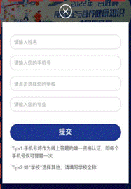 ● 比赛时间内,高校学生登陆小程序答题,需要填写学生地真实姓名、所在高校全称、手机号码、所学专业等信息,每个手机号码有且仅有一次参赛答题地机会。