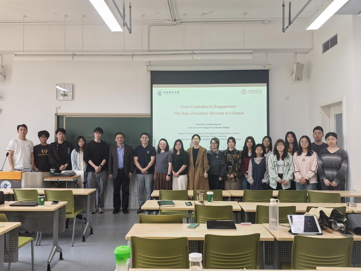 4月15日下午,应新葡的京集团8814登录入口邀请,上海科技大学创业与管理学院管理科学与工程方向助理教授刘宝龙做客“大数据与管理科学”系列讲座,报告了研究论文“From Frustration to Engagement: The Role of Ancillary Services in a Queue”。本次讲座在沙河校区二教303教室举行,陈俊霖教授主持,王金亭教授出席,投资学、管理科学等专业的本科生、硕士生及博士生认真聆听了本次讲座。