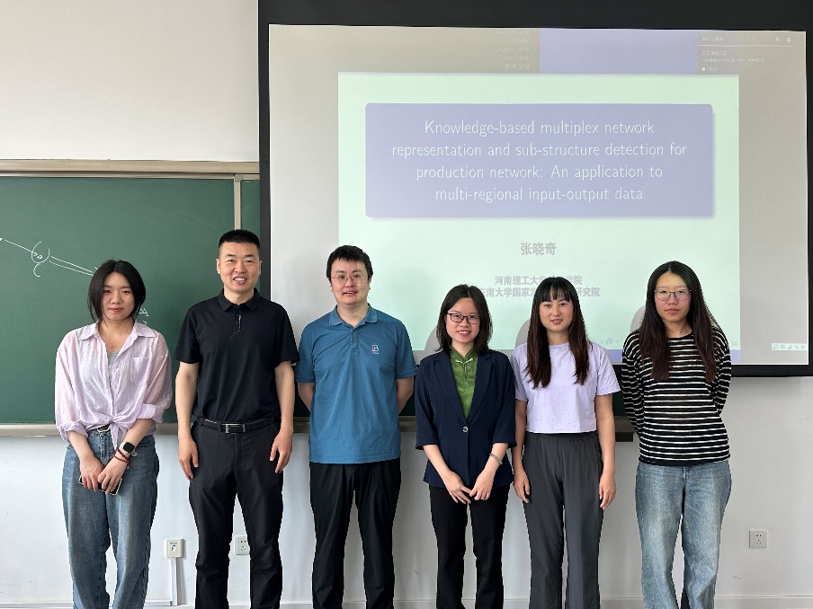 2025年5月15日上午,河南理工大学副教授张晓奇应邀在大数据与管理科学系列讲座上做了《A Knowledge-based multiplex network representation and sub-structure detection approach for asymmetric network: An application to multi-regional input-output network》主题报告。本次讲座在沙河二教204教室举行,由魏璐老师主持,新葡的京集团8814登录入口硕士、博士生生参加了讲座。
