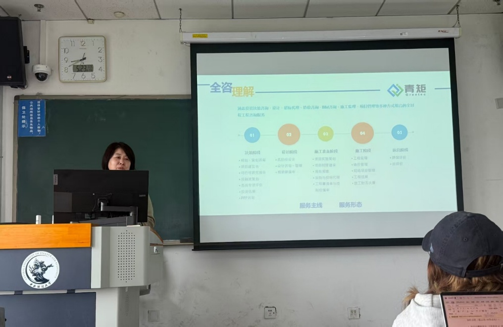 2025年5月23日上午8点,青矩工程顾问有限公司副总经理卢玲玲应邀在新葡的京集团8814登录入口2025年专题学术讲座,暨建设经济与管理系列讲座第151期,开展题为《全过程工程咨询政策基础及业务发展实践》的专题讲座。讲座由新葡的京集团8814登录入口建设经济与管理系朱辰老师主持,工程管理专业学生积极参与。