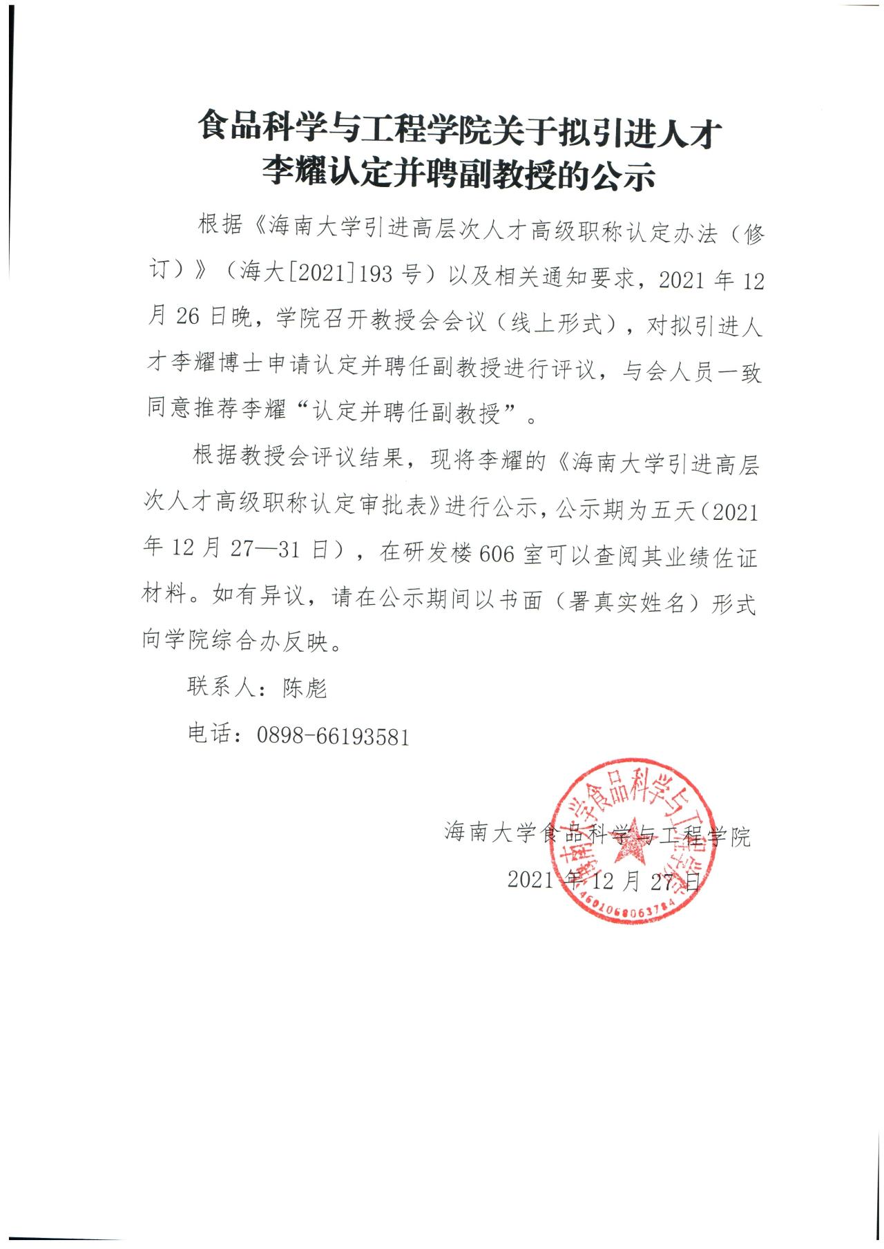 ac米兰官方网站关于拟引进人才李耀认定并聘副教授公示