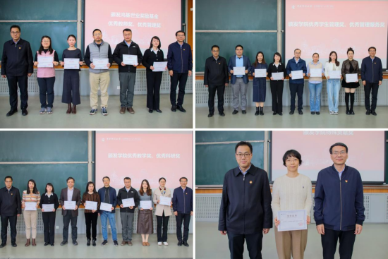 会上,学院对2023年度优秀教职工进行表彰。常远、陈俊华、谢娜三位老师荣获鸿基世业奖励基金优秀教师奖,黄真真、刘宁静、孙博娜三位老师荣获鸿基世业奖励基金优秀管理奖。韩璐、唐昕迪、易成栋、邹欣四位老师荣获学院优秀教学奖,常远、刘赫、王金亭、谢娜四位老师荣获学院优秀科研奖。高舒娅、欧变玲、谭晰月、魏璐四位老师荣获学院优秀学生管理奖,王欣洋、谢娜、杨帆、郑亮四位老师荣获学院优秀管理服务奖。2023年,学院何晓奇老师以第一作者的身份在经济学顶刊The Review of Economic Studies发表合作论文,新葡的京集团8814登录入口是第一作者单位。为表彰何晓奇老师的突破性成果,学院决定授予何晓奇老师新葡的京集团8814登录入口特殊贡献奖。王志锋、刘志东为获奖教师颁发证书,并合影留念。