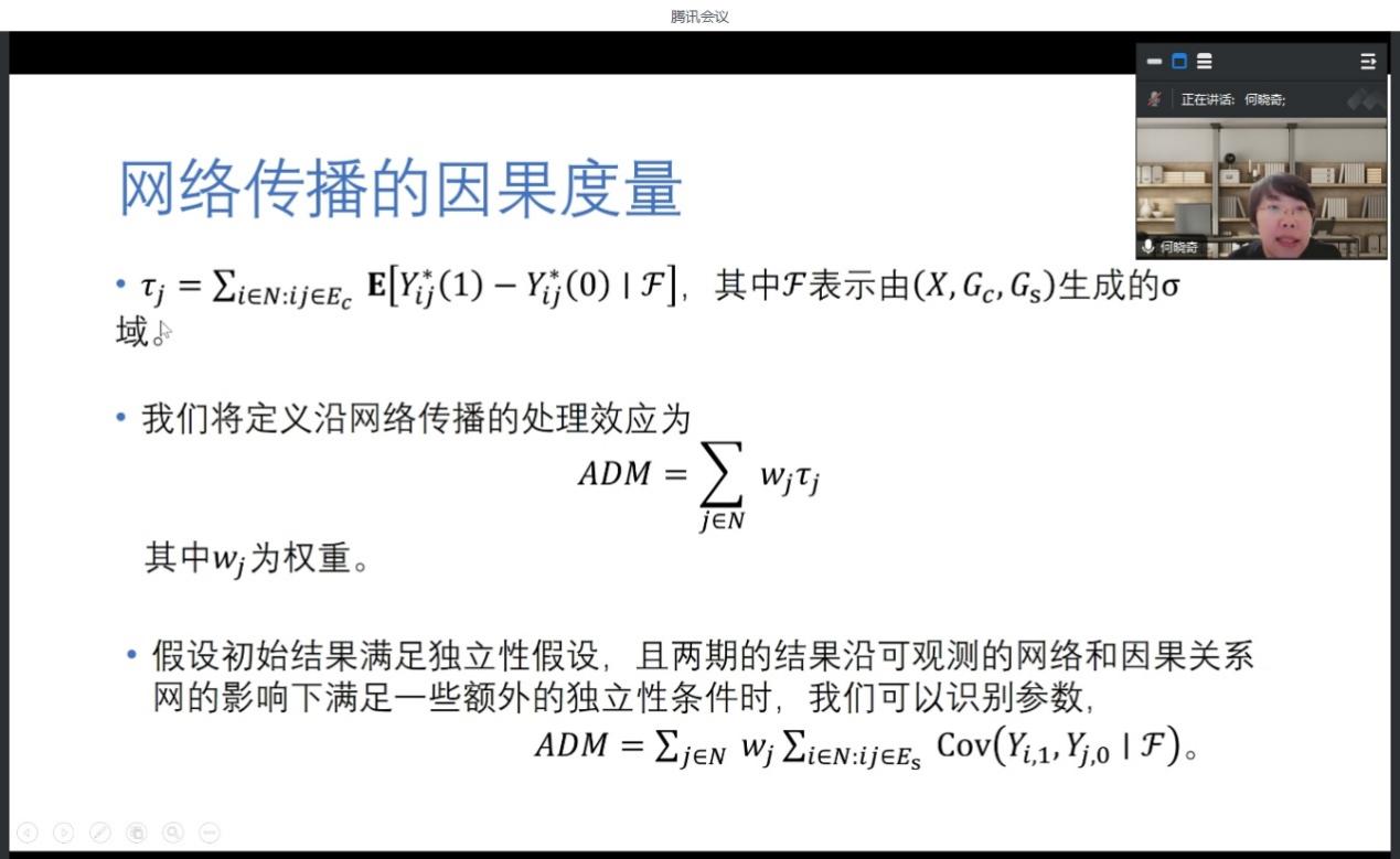 第二场学术讲座由新葡的京集团官网何晓奇助理教授主讲。讲座分为两部分,第一部分介绍了在顶级经济学期刊The Review of Economic Studies接收发表的研究成果“Measuring diffusion over a large network”,论文主要分享了建模过程,该论文的主要贡献是在社会网络模型下,确立了个体行为交互影响的溢出效应是来自关系网络,而不是个体特征,或者其他的环境相关性造成的,这对推动因果关系在网络溢出效应的理论发展具有重大意义。第二部分分享了自己的研究历程和一些心得体会,研究需要有兴趣也需要有毅力,此外踏实的基本功,持续的文献梳理和学习都是研究的必要手段,借此与同学们共勉!