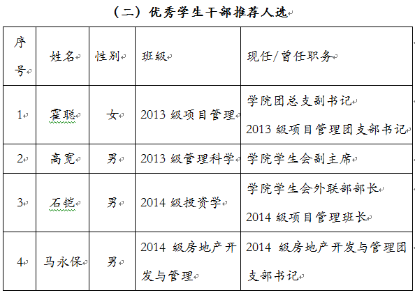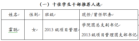 近日,根据校团字[2016]13号“关于评选2015年度校级 ‘十佳学生干部’、‘优秀学生干部’的通知”,学院组织了以上奖项的申报、初评工作。此次评选,共收到10名同学申报材料,经学院学生工作领导小组召开评审会,讨论决定以下推荐人选名单,现予公示。