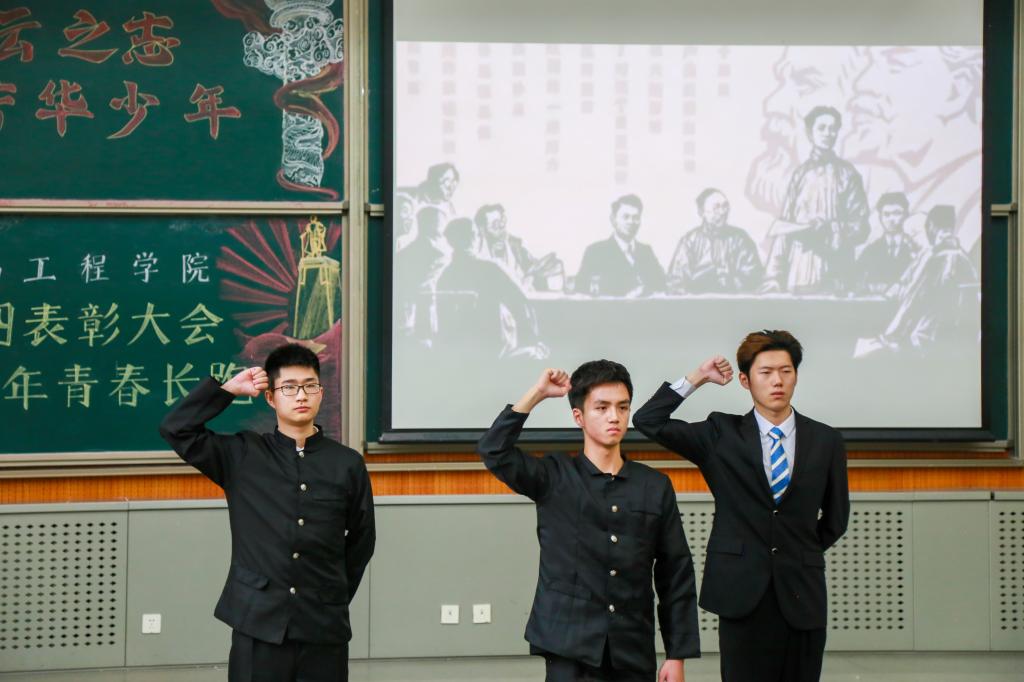 最后,大会上演了以“南陈北李,相约建党”为主线的历史情景剧。同学们亲身扮演陈独秀、李大钊等革命家。声情并茂、充满激情的表演仿佛把观众带回了那个奋进的年代,引起台下热烈掌声。一曲《不忘初心》,在场师生们自发跟唱,挥舞手中的红旗。在动听的旋律和舞团精彩的舞蹈中,五四表彰大会画上了圆满的句号。