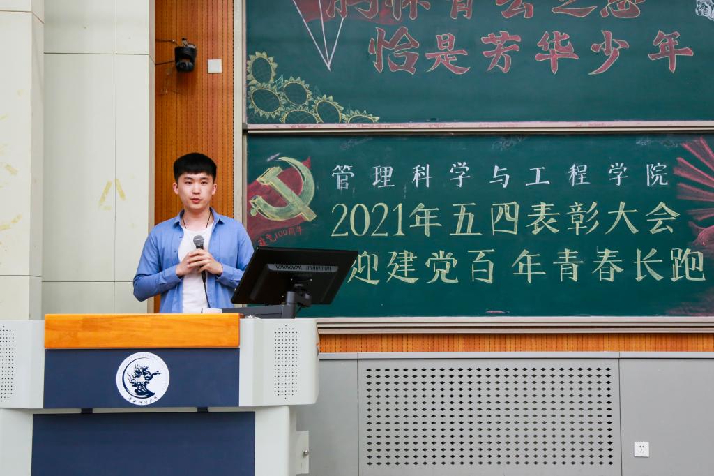 坚定理想信念,勇担青年使命。来自管理科学17班的武晖栋作为优秀个人代表给我们带来了他的奋斗故事。他从学校志愿服务经历到作为国庆70周年志愿服务的亲历者,在志愿服务中寻找学习的意义,奋斗的目标。他提到,身处竞争的激流中,我们应明确学习目的,唯有在知行合一中主动担当作为,执着奋斗,将个人的奋斗融入党和人民的事业中,才不至于在“内卷化”中迷失自我,同时也让自己的奋斗有了正确的方向和源源不断的动力。他号召同学们在百年未有之大变局的今天,主动奉献,勇于担当,将青春热血挥洒在祖国和人民最需要的地方。