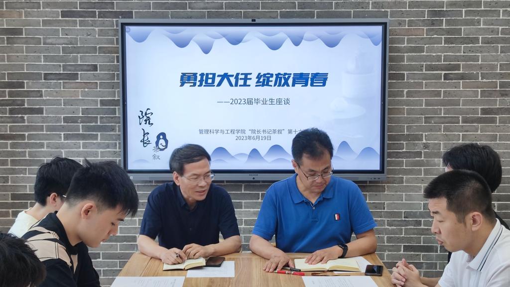 6月19日下午,学院在沙河校区4号楼320会议室,举行院长书记茶叙第十六期暨2023届毕业生代表座谈会。本次茶叙的主题是“勇担大任,绽放青春”。院领导王志锋、刘志东、李玉龙、荆中博、胡博与2023届本硕博10位毕业生品茶交流。研究生毕业班辅导员魏飘飘、本科生毕业班辅导员高舒娅一同参加茶叙。会议由党委副书记胡博主持。