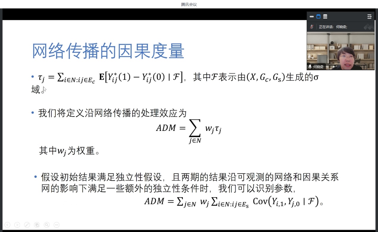 第二场学术讲座由新葡的京集团官网何晓奇助理教授主讲。讲座分为两部分,第一部分介绍了在顶级经济学期刊The Review of Economic Studies接收发表的研究成果“Measuring diffusion over a large network”, 论文主要分享了建模过程,该论文的主要贡献是在社会网络模型下,确立了个体行为交互影响的溢出效应是来自于关系网络,而不是个体特征,或者其他的环境相关性造成的,这对推动因果关系在网络溢出效应的理论发展具有重大意义。第二部分分享了自己的研究历程和一些心得体会,研究需要有兴趣也需要有毅力,此外踏实的基本功,持续的文献梳理和学习都是研究的必要手段,借此与同学们共勉!