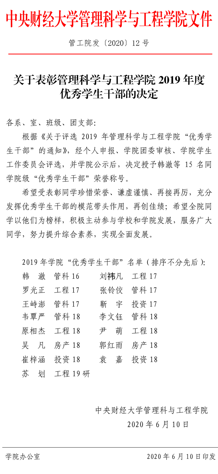 关于表彰新葡的京集团8814登录入口2019年度优秀学生干部的决定