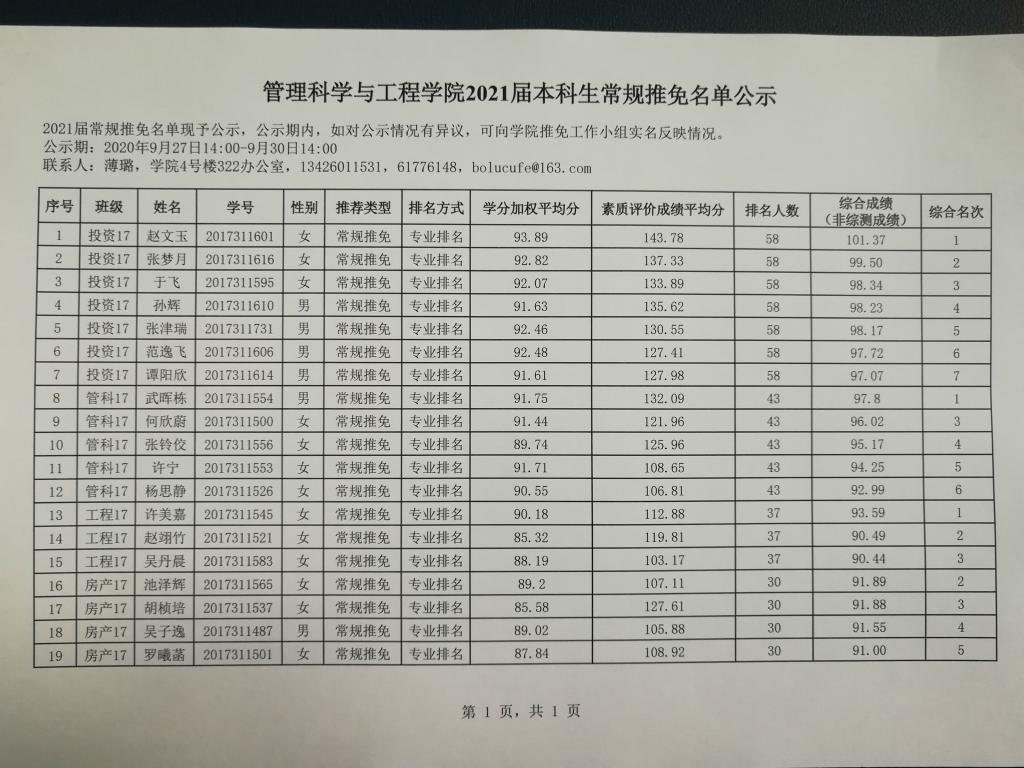 新葡的京集团8814登录入口2021届本科生常规推免名单公示