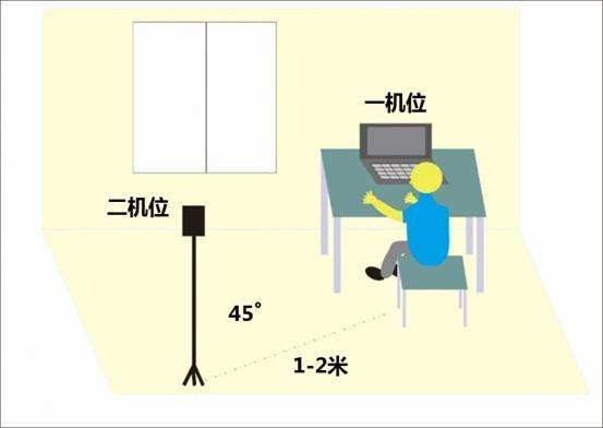 (1)考生“双机位”要求。“第一机位”采集考生音、视频源(考生正前方);“第二机位”采集考生“第一机位”显示器及考生所处环境的整体情况(远端)。“第二机位”须可自由移动,考试过程中考生须根据考官指令随时变换机位位置。“双机位”涉及的硬件设备的电脑桌面以及手机不得存放考试相关的电子资料。考生需要准备可以支撑“双机位”运行的硬件,即需要两部带摄像头的设备及附件,包括笔记本电脑、手机、手机支架等。第一机位(建议电脑端)从正面拍摄,放置在距离本人30cm处;第二机位(建议手机端或者电脑端)从考生侧后方45°距离本人100cm处拍摄,确保第一机位和第二机位分别从考生面前和身后完整拍摄到考生上半身、复试组教师能够从第二机位清晰看到第一机位屏幕。